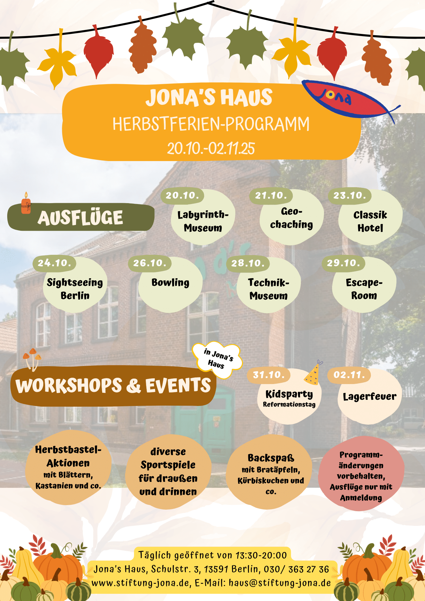 Beim Bowling wird es ferner sportlich und beim Geo-Caching spannend. Auch in Jona‘s Haus selbst wird der Herbst mit Leben gefüllt: durch thematische Bastelaktionen, kleine Backabenteuer und jede Menge Spaß und Bewegung. Ein besonderes Ereignis ist unsere Kids-Party zum Reformationstag, bei der verschiedene Stationen zum Spielen, Basteln und Bewegen auf die Kinder und Teens warten.